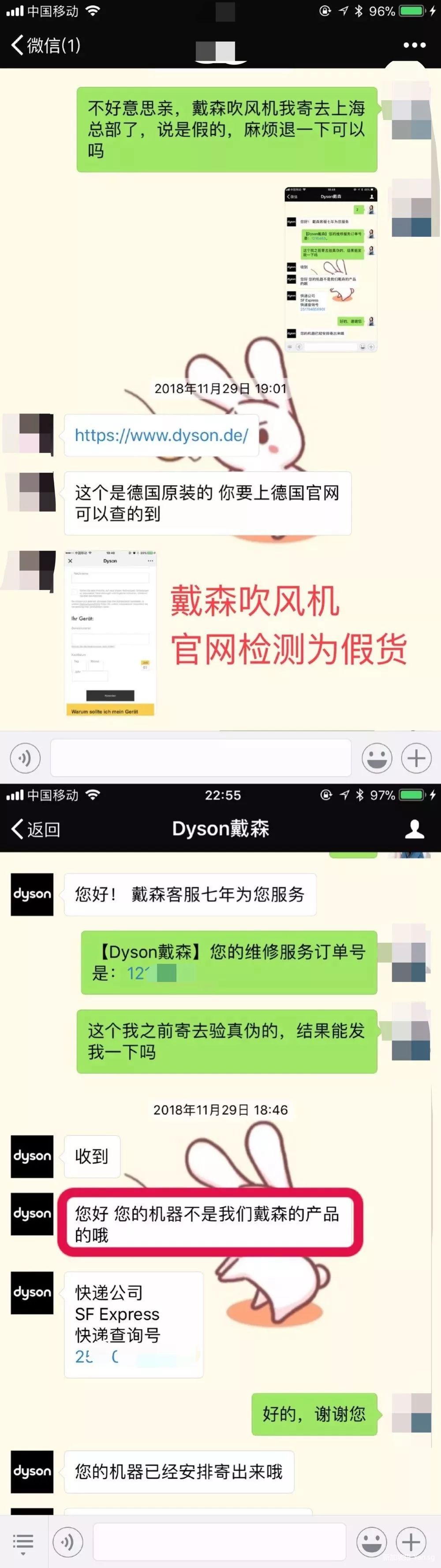 我在公安报案没人受理,去工商局投诉也没人受理。除了邮差包,戴森吹风机也被鉴定为假货: