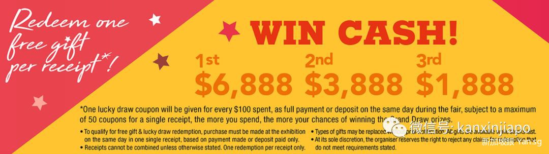 这么多优惠折扣的项目有没有戳中你的心??现场除了有更多的优惠商品品牌外,还可以抽取现金!!最高奖励高达6888新币!