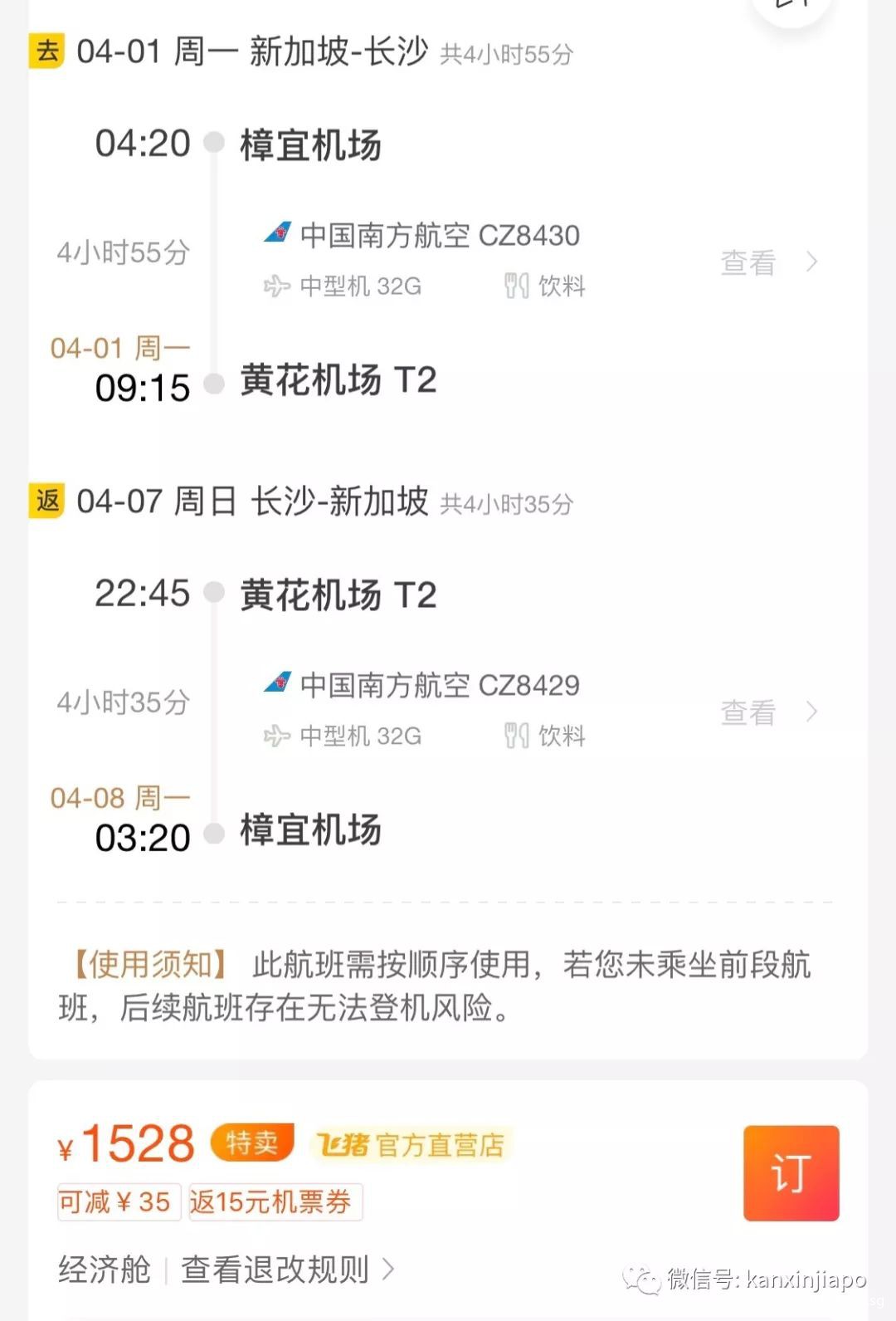 究竟有多便宜,眼哥帮大家查了一下,3月31日到4月7日,新加坡往返长沙,含税含行李,一共才1528人民币(约300新币)。