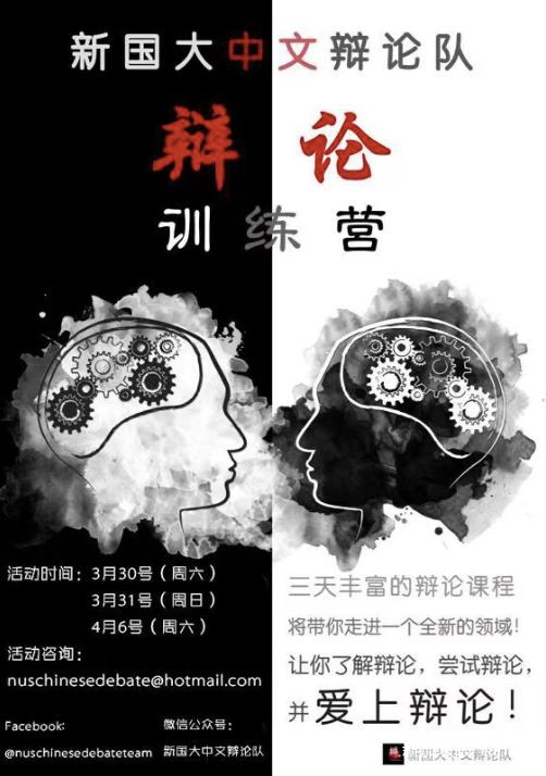 如果你喜欢辩论,那就不要错过新加坡国立大学中文辩论队举办的中学生华语辩论营。两天辩论课加实战训练,一天辩论训练赛,激发你对辩论的无限可能!你将有机会全程与获得国际华语辩论赛冠军的学长学姐零距离互动哦~