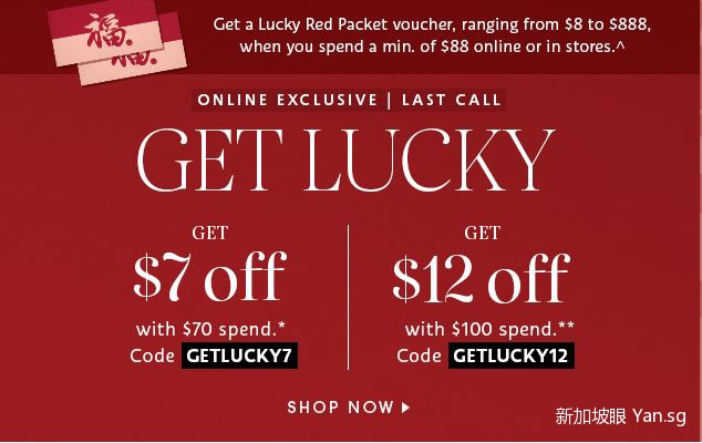 消费满$70,减$7,优惠码:GETLUCKY7;消费满$100,减$12,优惠码:GETLUCKY12