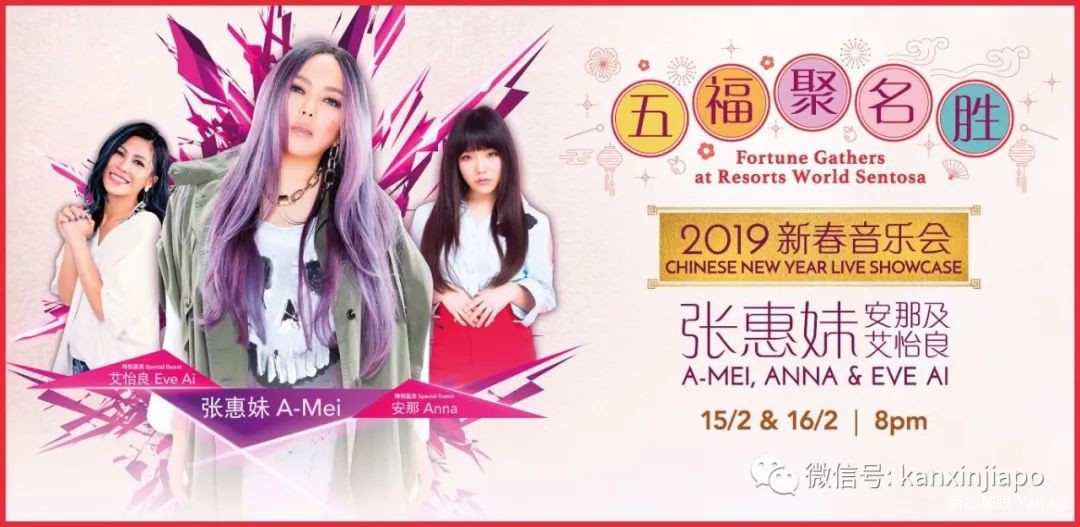 日期:2019年2月15、16日(周五及周六), 晚8点表演时长:90分钟购票地址:https://www.sistic.com.sg/events/amei0219票价:S$78-S$228据说,16号的演唱会门票现已售罄,大家快去抢15号的票啊!