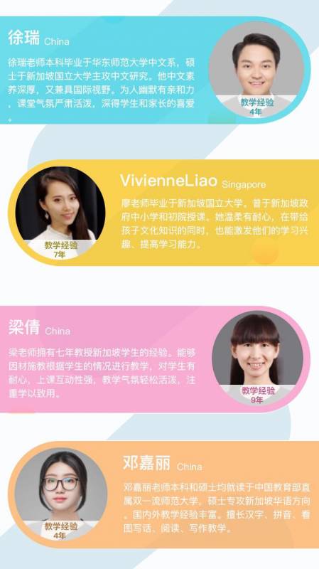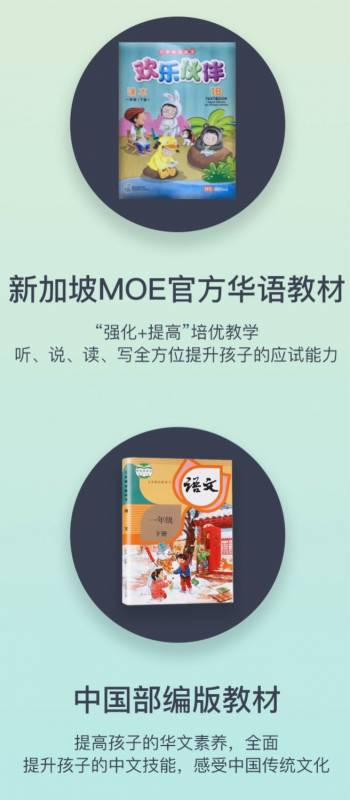 经验丰富的本地老师,还有来自NUS、NTU、北大、清华、北师大的成员。一方面,他们根据新加坡MOE官方华语教材《欢乐伙伴》精心设计双语版同步课程,采用“强化+提高”的培优教学思路,听、说、读、写全方位提升孩子的应试能力。另一方面,采用中国最新的部编版教材,根据新加坡的语境,精心设计高级版课程,提高孩子的华文素养,全面提升孩子的中文技能,感受中国传统文化。