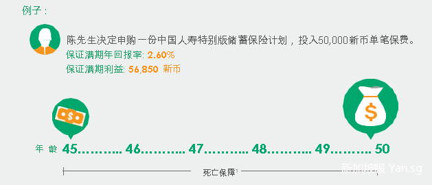 举个例子,若投保人一次性支付至少5万(含)新元保费,可享有2.6%保证满期年回报率,期满取回本金。 这意味着支付5万元保费,五年后可保证拿到5.685万元。若投保人一次性支付保费为2万新元,可享有2.38%的保证满期年回报率。五年后可保证拿到2.2498万元。