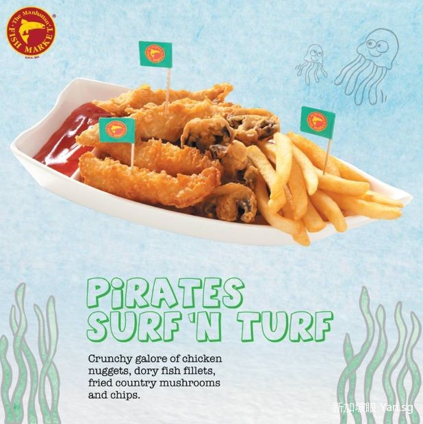 凡购买一份主食,儿童就可以免费享有餐点,选择多样化,包括Pirates Surf ‘N Turf、Spag ‘N Chick Treasure Treats等~