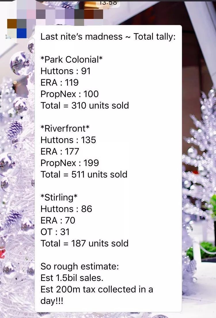 昨晚在8点至9点之间才开的三个新楼盘,兀里Park Colonial、女皇镇Stirling Residences、后港Riverfront Residences ,在短短三、四个小时内,交易量就达到了15亿新币!