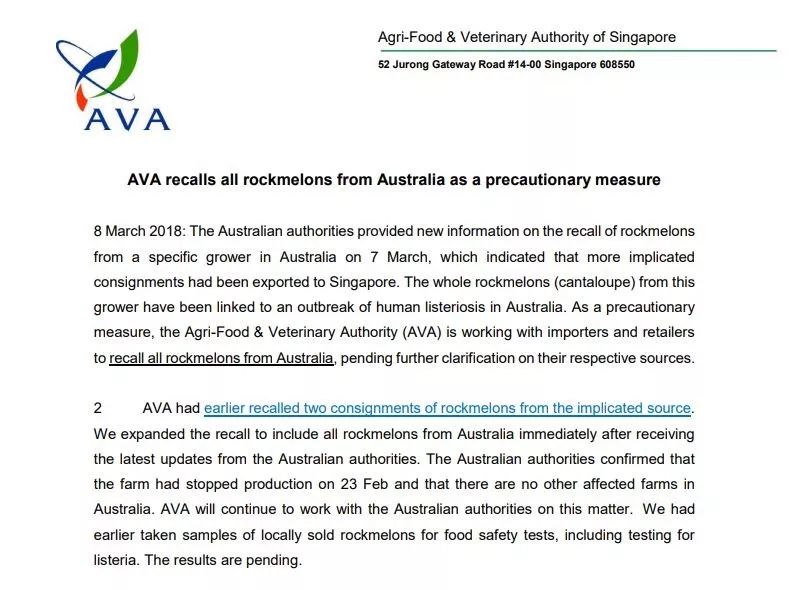 为了以防万一,农粮局于昨日(3月8日)再次发出公告,宣布召回所有从澳大利亚进口的哈密瓜!