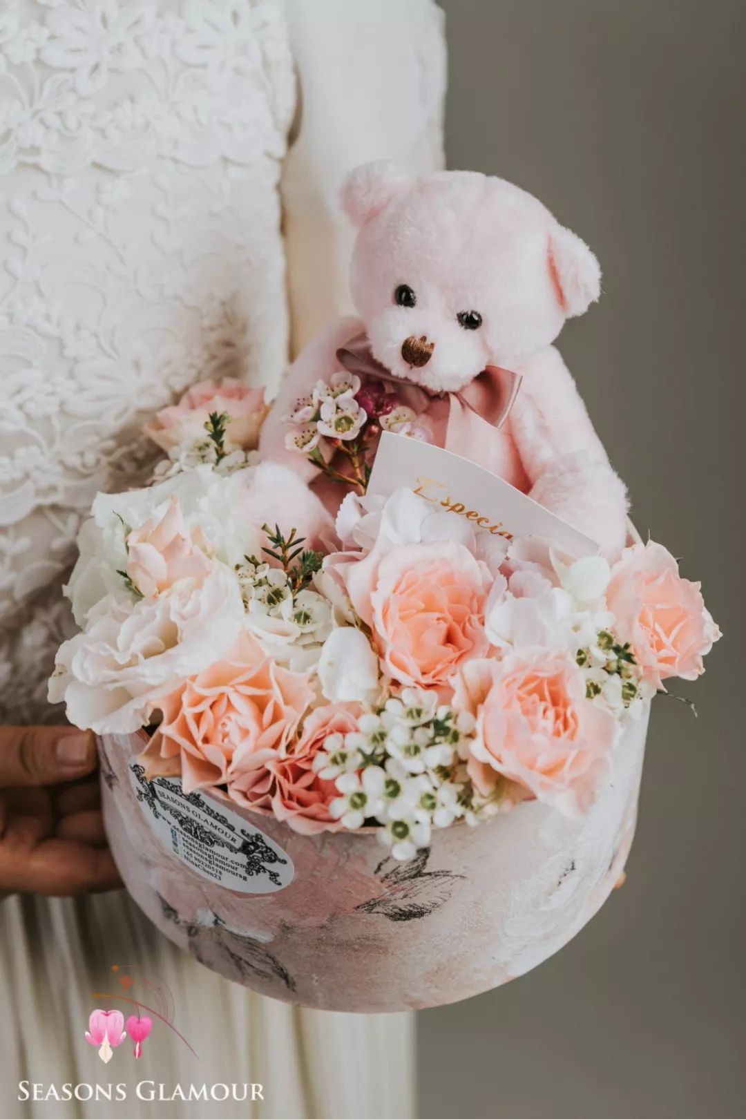 主花花材:肯尼亚多头珊瑚玫瑰+台湾桔梗+珊瑚粉抱抱熊