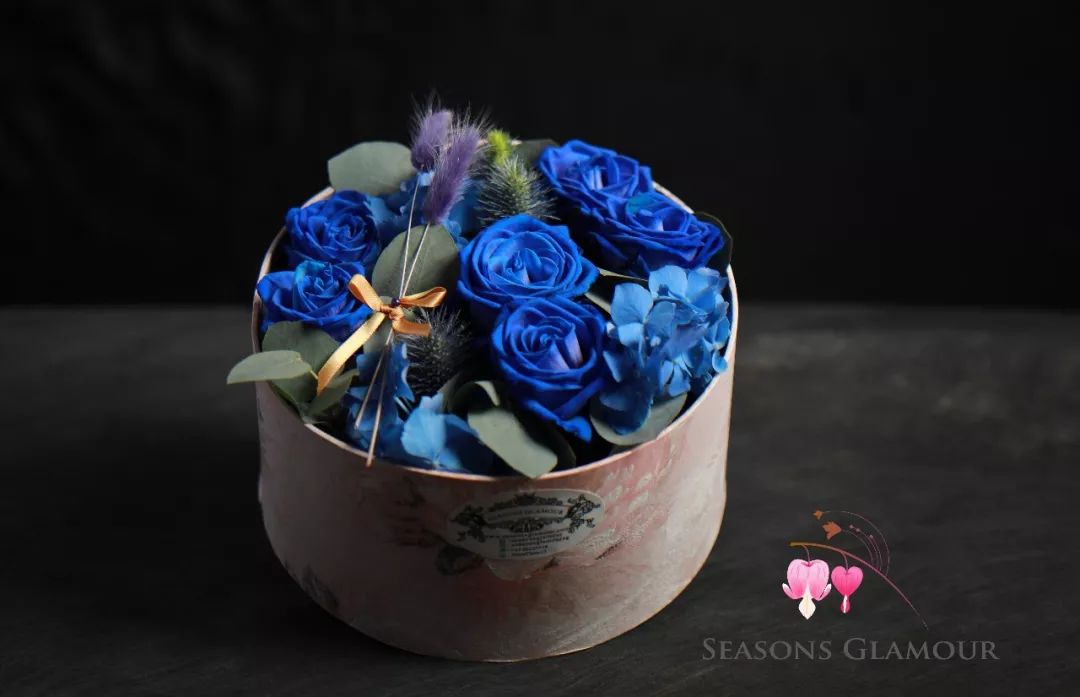 主花花材:荷兰蓝玫瑰*6枝+哥伦比亚绣球+鼠尾干花装饰