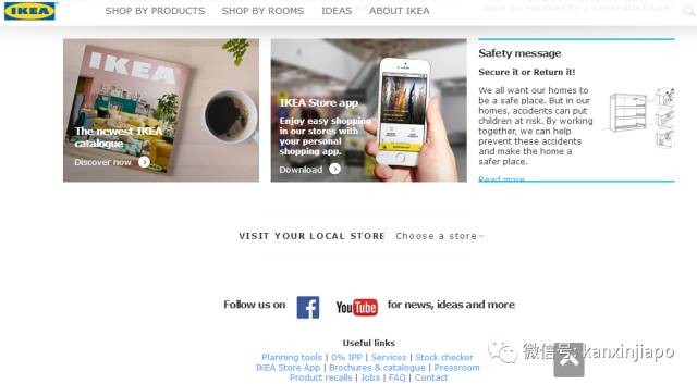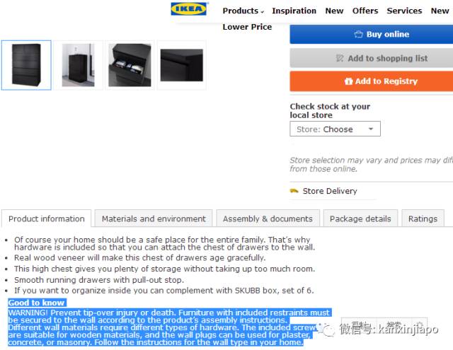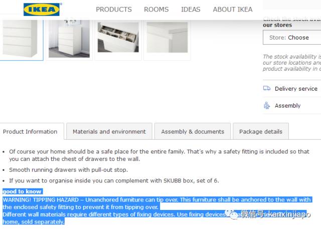 ▲新加坡宜家官网首页最下方才可以看到与马尔姆抽屉柜相关的安全提示