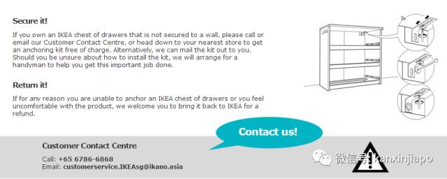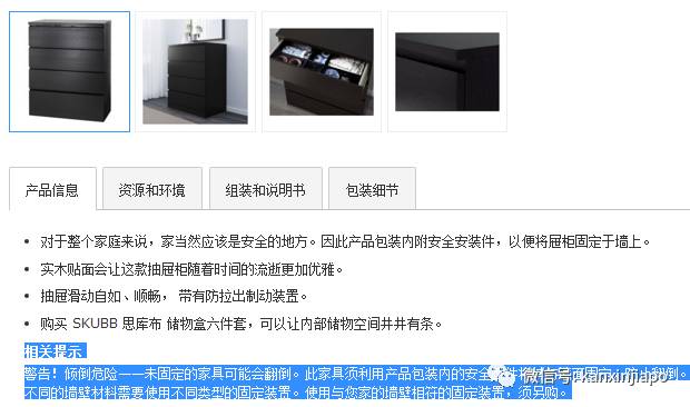 中国宜家官网提示消费者可以免费订购墙上固定零件,除此以外对抽屉柜只是提出安全提示,没有任何深入的解决方案!