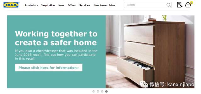 ▲美国宜家官网首页,醒目位置提醒客户处理马尔姆抽屉柜安全隐患