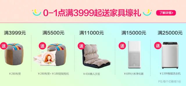 拼不过手速依旧有礼物!在9月25日指定时间内购买产品,付款金额满3999元起就送家具家电,布凳、抱枕、懒人沙发、空气净化器、冰箱……基本上就是买就送了!!!