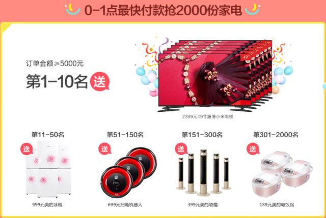 9月25日,在指定时间内购买产品,付款时间最快且付款金额优先满5000元以上,前2000名就可以直接获得对应的家电大礼:电视、冰箱、扫地机器人、塔扇、电饭锅 ……也太爽了吧!