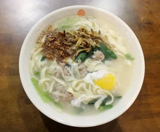 板面一般是由小麦粉现做的,比较有嚼劲,有干捞和汤面两种选择,一般的配料就是香菇肉,青菜,江鱼仔和葱,再加个鸡蛋。