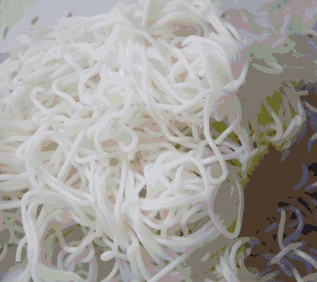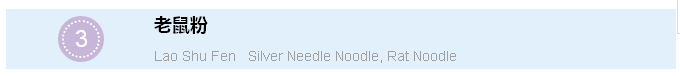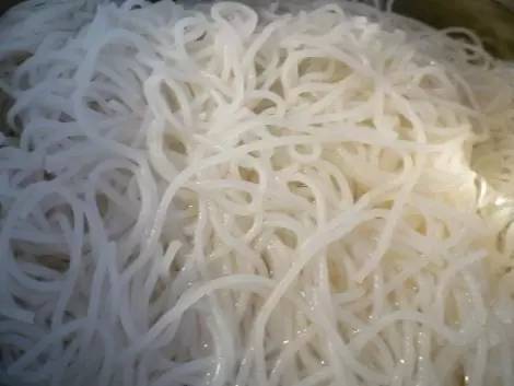 同样起源于中国南方,老鼠粉名字比较可怕,但其实是用米粉、淀粉混合制作的一种“面”,只因为比较粗短,像老鼠尾巴而被冠了这个名,也有人觉得“老鼠粉”听上去不太雅观,就起了“银针粉”的名。相对于米粉,老鼠粉的口感比较偏粘软,还有一点微微的甜味。