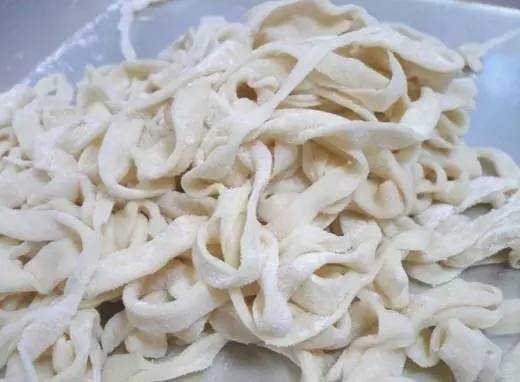 由小麦粉加上鸡蛋制作,所以带着淡淡的黄色,但是因为是机器切制的,不会特别韧!