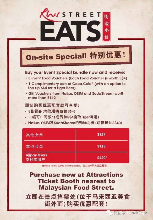 即日起至8月20日,到圣淘沙马来西亚美食街,用支付宝支付,有机会$20抵$75。现在还有新加坡眼粉丝专属口令红包,口令:“名胜世界街边小食”。上支付宝APP红包通道领取吧。