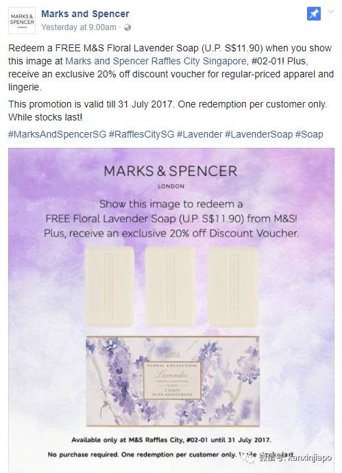 出示以下Facebook的截图,就可以免费获得一块价值11.9新币的薰衣草皂,同时还可以获得8折优惠的衣服券~