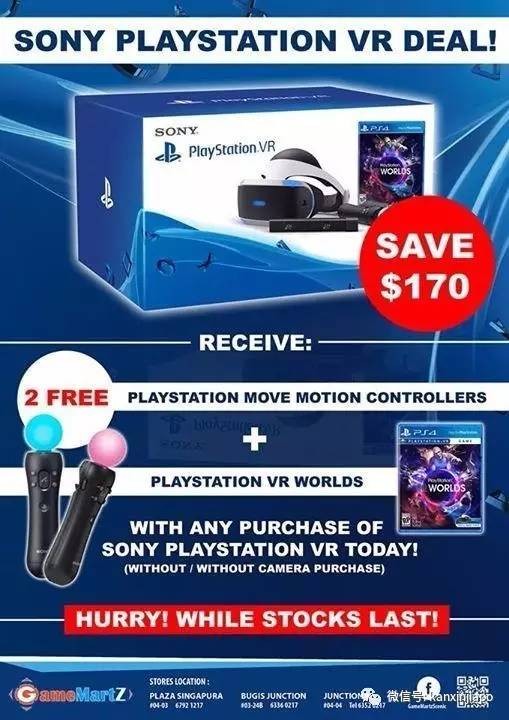 Playstation VR 优惠170新币!同时赠送2个免费的VR控制手柄,以及VR world游戏。