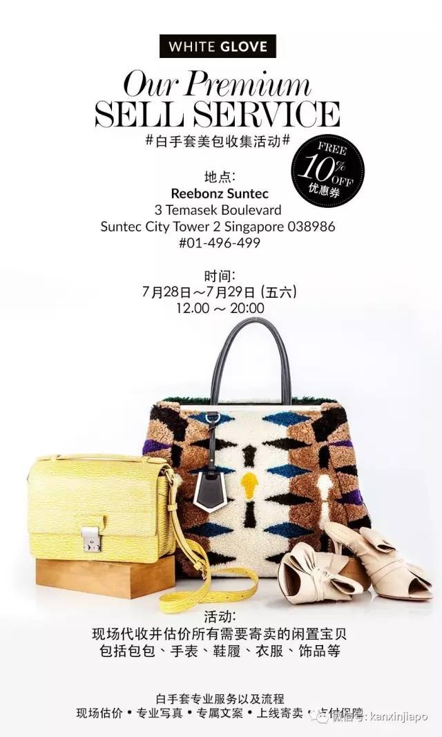 Reebonz白手套美包收集活动本周末Reebonz将再次启动线下【 白手套收集闲置美包活动】!现场代收并估价所有需要寄卖的闲置宝贝(包包、手表、鞋履、衣服、饰品等)。同时还能获得10% OFF赠品官网优惠券。哒lin们,记得至少要三件或1件市值相当5000新币的宝贝!现在关注Reebonz_SG微信,将获得最新、最好玩的时尚资讯和及时优惠。