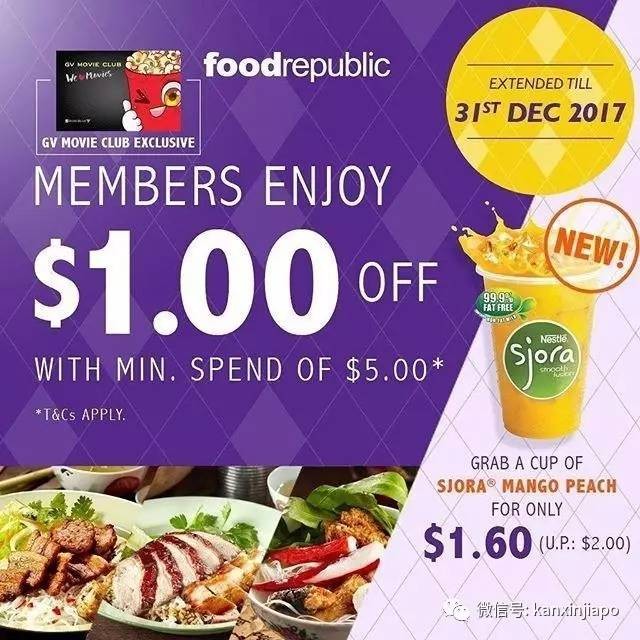 只要是GV电影院的会员,就可以在Food Republic消费满5元减1元,还可以用1.6新币的价格购买芒果桃子饮料