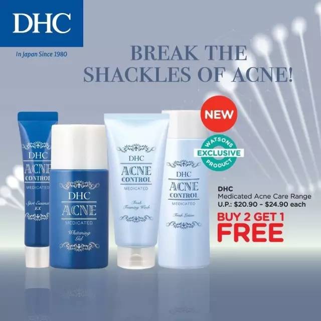 在屈臣氏DHC购买任意两件 Medicated Acne Care Range产品则享受一件免费