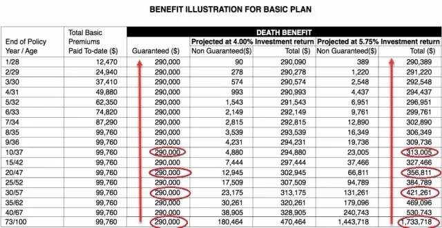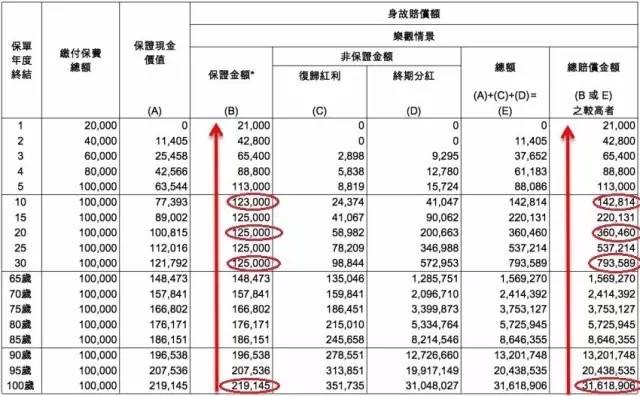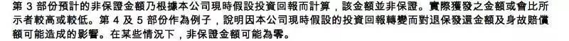 这是香港公司在建议书的说明里,明确写出的说明,不知道有多少人在购买时有被提醒过!非保障金额可能为零,也就是说,分红部分有可能一分也拿不到!这一点,哪里的保险都一样。这也是为什么,我一定要将保证金额,作为重点对比。允我在这里多一句感慨,保险这个行业,之所以受大众误解这么深,除了保险经纪有时会为了个人业绩略有欺瞒,也不排除部分公众的得益心理。只是想提醒大家,保险公司毕竟不是做慈善的,请不要对过高的预期收益,抱有太不切实际的幻想。同时,请自行对保单合同进行二次信息确认,有疑问及时联系经纪。哪部分一定会拿到,哪部分可能一点都拿不到,经纪人没有告诉你,合同里一定会写的清清楚楚。