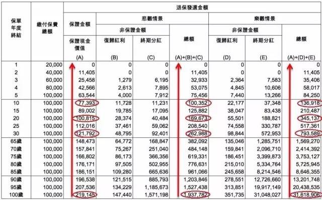 有人一定会有疑惑,这种分红险比对保证金额的意义在哪?为什么不直接比对悲观或是乐观情景(或新加坡4%或是5.75%的年化收益)预期金额?香港保险之所以如此火爆,相信很多人也是看中了建议书里,那非常可观的预期金额。