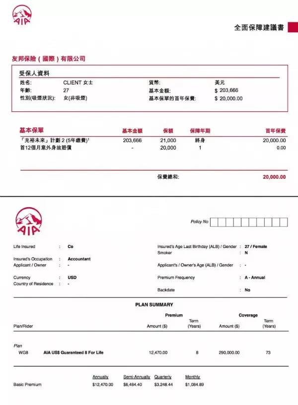 两地保险到底有什么区别?到底哪个更适合自己?相信是很多人心里的疑惑,今天就让我带你,直接从建议书入手,简单粗暴的分析一下:情景假设:小莉,27岁,不吸烟,职业女性。请看友邦(AIA)香港很火的美金产品充裕未来和友邦(AIA)新加坡保费类似的美金产品建议书的比对(中文繁体为香港公司建议书,英文为新加坡公司建议书)