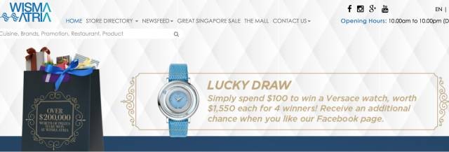 凡在乌节路的威士马广场(Wisma Atria)消费100元就有机会参加幸运抽奖,获得价值1500元的范思哲手表一只(共4名获奖者)!其余奖品还有: