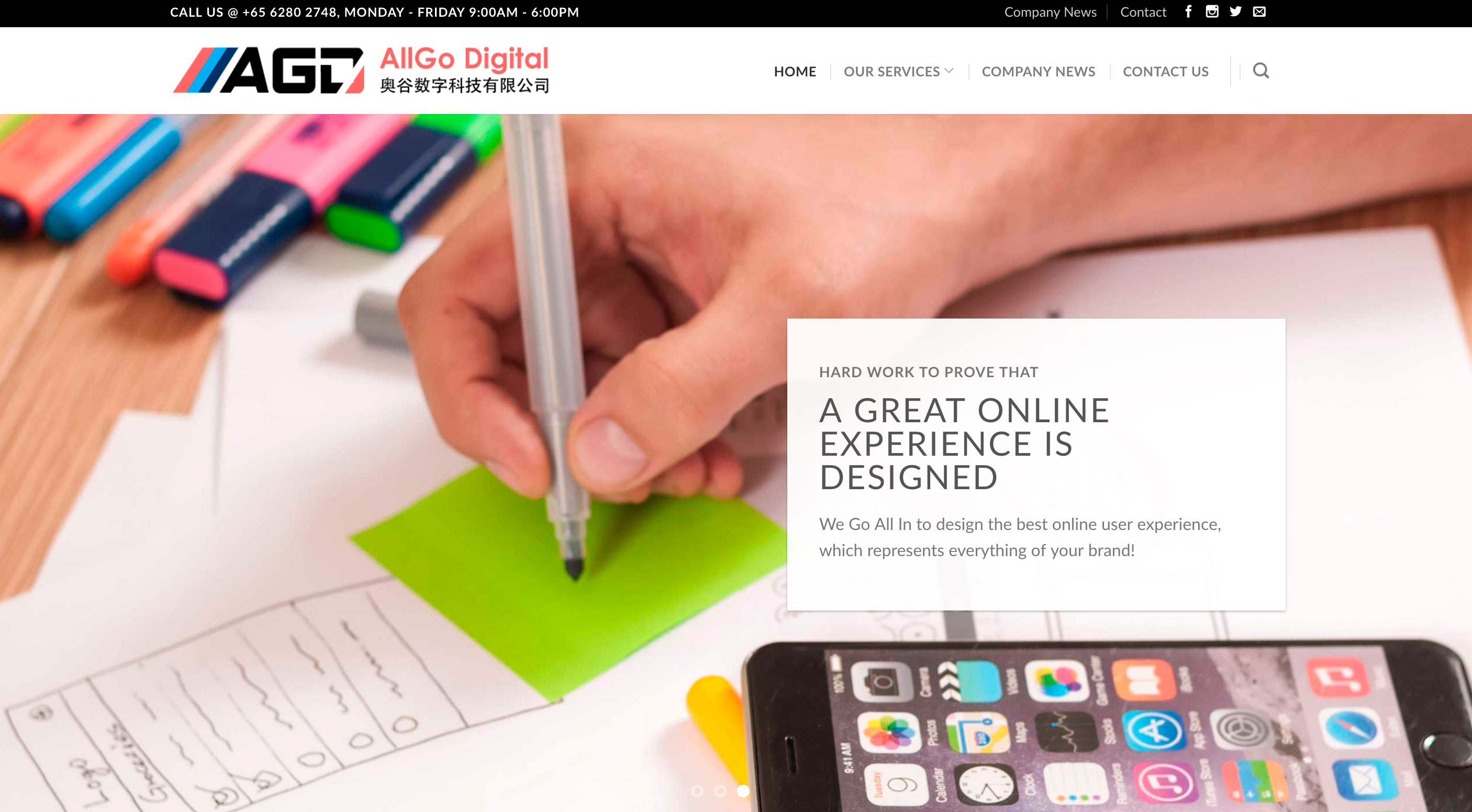 由于大部分本地互联网服务企业都是以英文为主,对于中文市场不熟悉,在新加坡的中商最头痛的问题就是无法找到一间合适的服务提供商理解并有效的将企业的形象与产品在线上做出完美的诠释与英文的语言与创意形象转化,奥谷数字科技有限公司(AllGo Digital Group)是一间独有扎根新加坡着重服务中商企业能更好服务本地英文市场为宗旨的数字技术开发的公司,其服务包括: