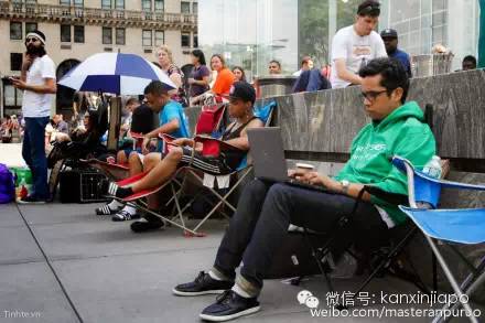 日本推特上一位名为“app_taylor”的大学生是枚不折不扣的死忠果粉,他和小伙伴9月6号便在东京银座苹果门店前扎下营寨,开始排队等待iPhone6发售……他们顶风冒雨露宿街头却乐在其中,还一边看看美网公开赛,一边收收快递(竟然还能送到…),吃着路人给他们的方便面傻傻地等……