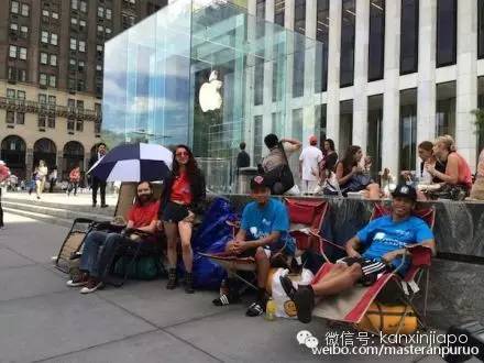 两款iPhone 6手机将于9月19号在美国等9个国家地区首发,很多人5天前就已开始在苹果零售店外排队等待。据一身在美国的华商微博粉丝爆料,17日晚他们所在的城市就已经有人开始排队了,一个华人面孔的黄牛非常厉害,25把椅子一个人看着。话说第一个粉色马扎好亮!