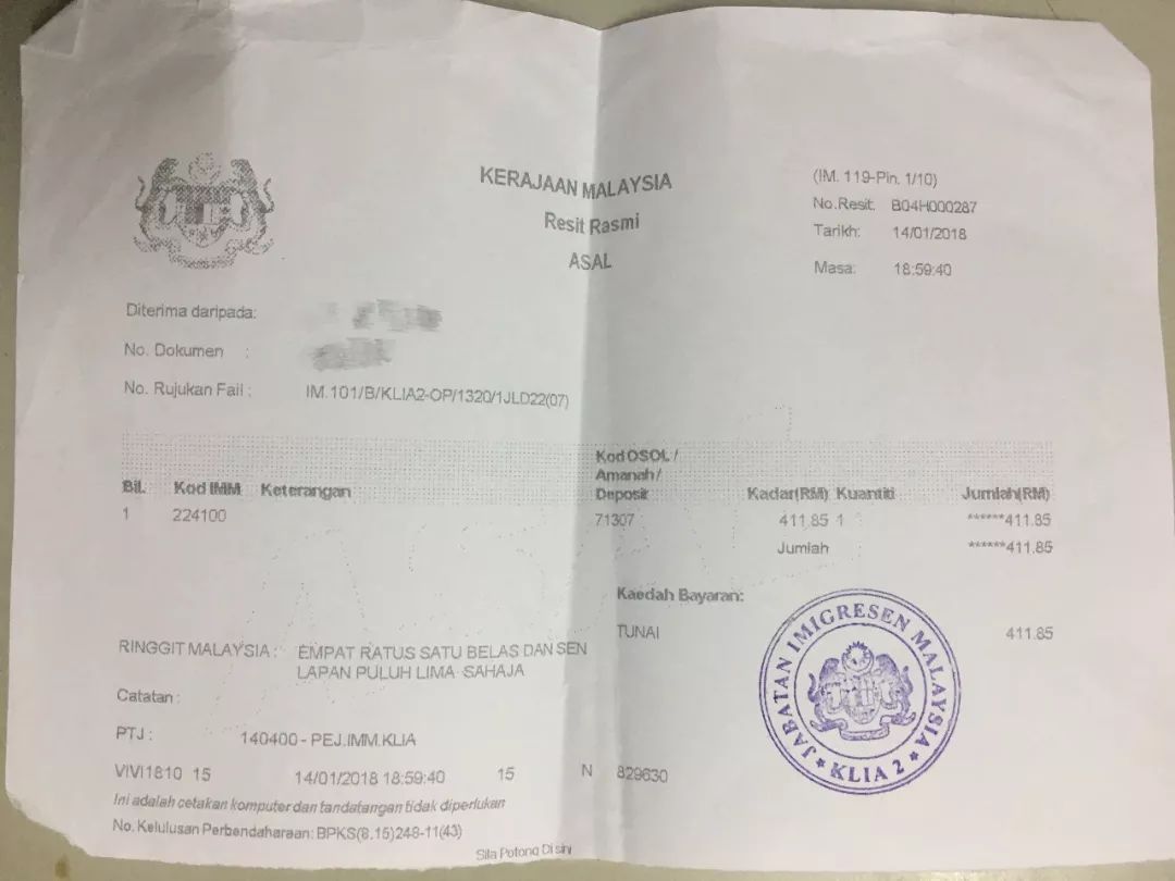 下了飞机,出关的时候我就跟柜台的工作人员说要办落地签,于是他指了指旁边一个区域。顺着他指的方向很快找到了办理落地签的窗口,我把护照ic行程单交给窗口的工作人员。他让我等一会儿,于是我就静静地等,大约过了20分钟他说可以了,费用是411.85RM,(之前网上看是450RM,不知道为什么变成这样的数字),付了钱给了张类似发票的纸我就顺利出关了,并且我的护照上并没有敲任何图章。网上说落地签是7天有效期,但是我在发票上也没找到任何相关说明,不过反正我是第二天就回新加坡的。