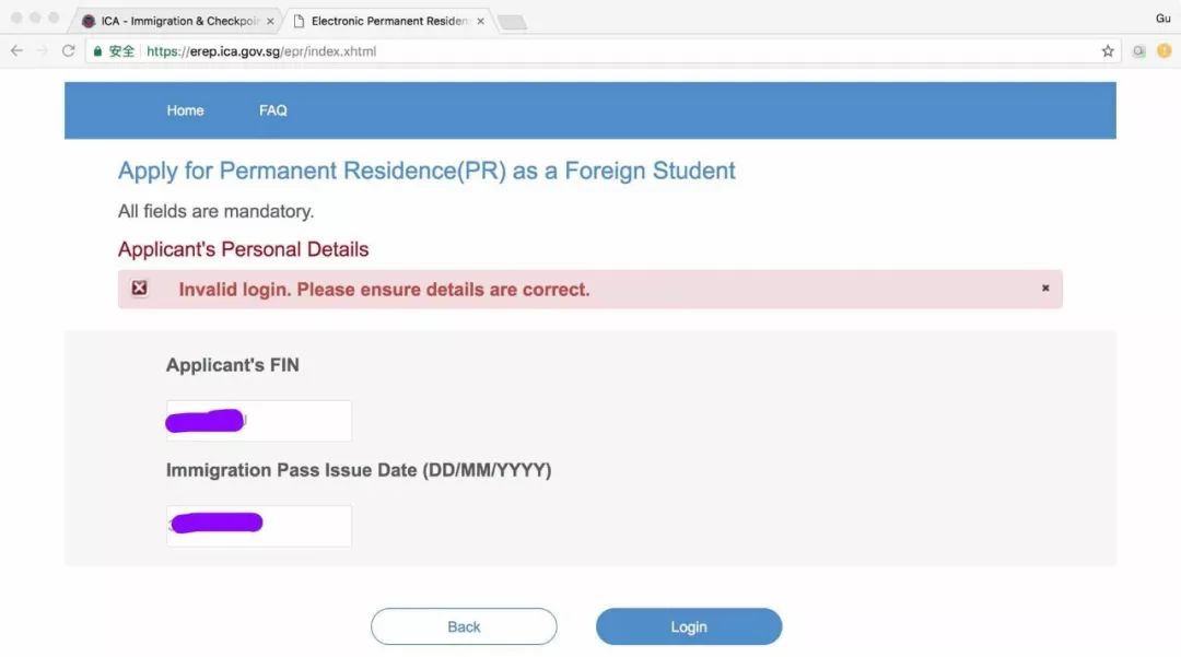 ▲申请PR的证件登入界面显示信息错误