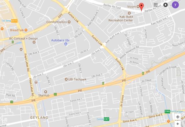 地址:7 Kaki Bukit Ave 3,就下图右上角箭头所指位置,在工业区里,周围没有地铁站(最靠近的是图左上角的环线Tai Seng站、图下方的东西线Euros和Kembangan站,都比较远),交通不太方便,所以一般上大家都得搭德士去。