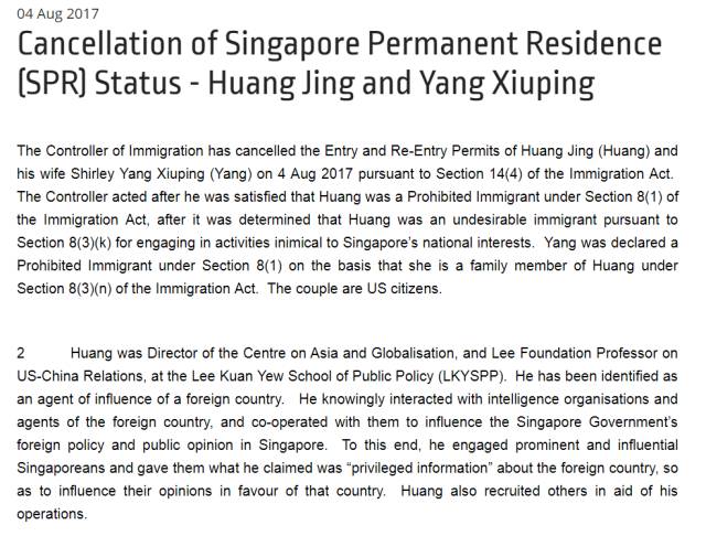 就在8月4日,新加坡内政部发布长文公告称:NUS荣誉教授黄靖在知情的情况下与国外情报机构和情报人员接触,与他们合作影响新加坡政府的外交政策和本地舆论,该局将取消黄靖夫妇的本地永久居留权,并永久禁止两人入境新加坡。