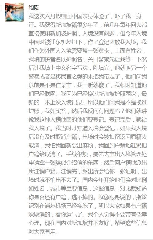 从目前的澄清来看,即便没有注销国内户籍,应该是可以出境的。但提醒大家,注销国籍时,户籍不会自动注销。为了防止以后产生麻烦,还是建议持新加坡护照的网友,尽快去注销户籍。