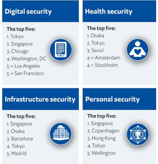 经济学人智库把全球五大洲共60座城市以数据、医疗、基建和人身安全因素评估每座城市的安全性,满分100分。