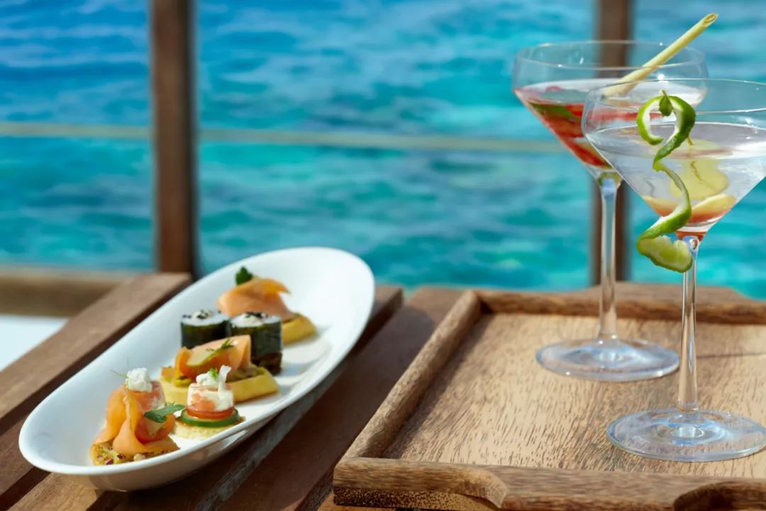 在沙滩酒吧(Sand Bar),客人可以在悠闲地躺在日光躺椅上享受新鲜创意的鸡尾酒,或者一边品味精美的小食,一边欣赏美丽的海洋风光。在马尔代夫最大的泳池边观赏落日的余晖,品尝美味的开胃酒,沉浸在现场乐队演奏的动人旋律中。
