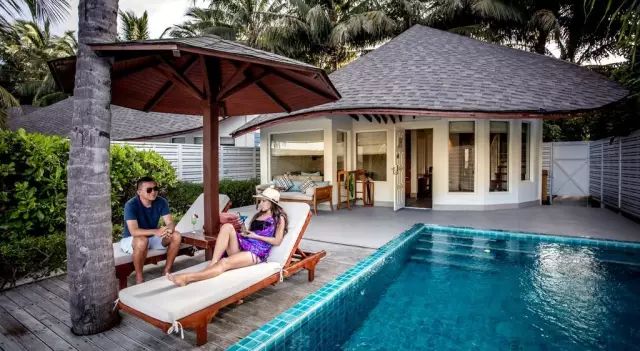 在水上天堂享受独一无二的美景。静静凝视环礁湖绿松石丌断变化的色彩,或在私人露台上享受沐浴的快乐。或者,您还可以在海滨泳池中畅享清凉。在沙滩和环礁湖的环抱之下,所有的水上别墅洋溢出浓郁的泰式风情,独具马尔代夫魅力的建筑配备了完善的现代设施。