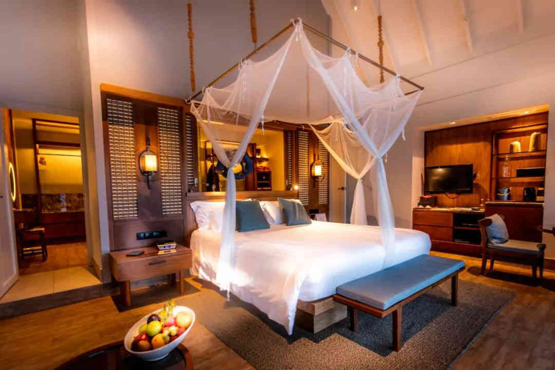 具有112套房及别墅,在海滨的7个类别,并在水面的住宿范围从76平方米海滩套房完成独立的客厅,大阳台,室内和室外阵雨,达146平方米的豪华海滨泳池别墅,其中包括了岛俱乐部,为客人提供住宿在某些类别的“在一个度假胜地”的经验,包括豪华阁贵宾廊,是免费餐,小吃和饮料,免费晚间鸡尾酒和小吃日常份使用。