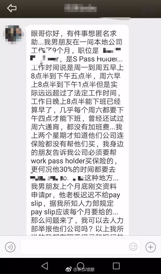 编者按网友自述男友持有SP签证,在一家建筑公司做项目工程师,超长工作时间,老板不仅没给加班费,保险也没买。发工资时,老板不提供工资单。她想去人力部举报这个公司,又怕影响男友申请PR,她该怎么办呢?