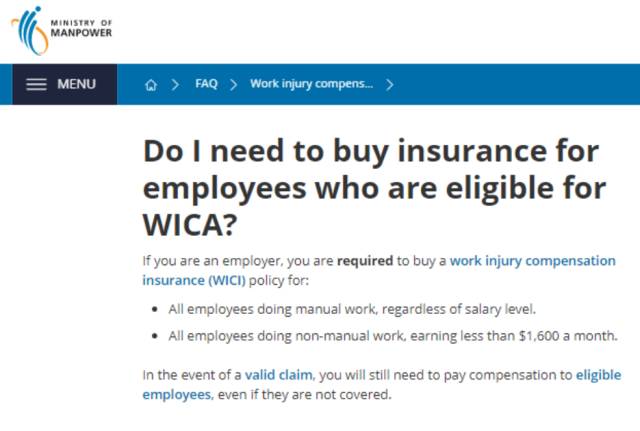 雇主必须为体力劳动者或者薪资低于1600新币非体力劳动者(暂且先这样翻译,如有更好欢迎指正)购买工伤赔偿保险。