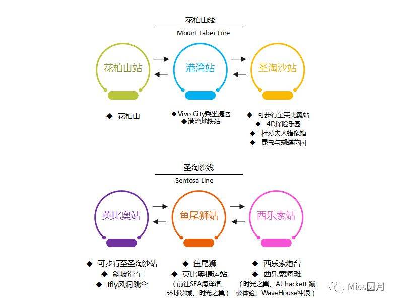 新加坡空中缆车包括花柏山线和圣淘沙线,前者包括花柏山站、港湾站和圣淘沙站,后者包括鱼尾狮站、英比奥站和西乐索站。其中,圣淘沙站和英比奥站之间步行距离大概5分钟,所以两条线路之间换乘非常方便。