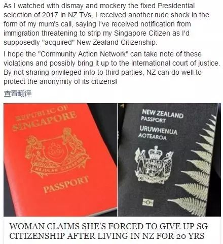 最近也爆出一位居住在新西兰长达20年的新加坡女子,自爆新加坡移民厅通知她,将剥夺其新加坡公民的身份,理由大概是~既然她呆在新西兰的时间,比在新加坡的多得多,她更应该去拿“新西兰公民”的身份。