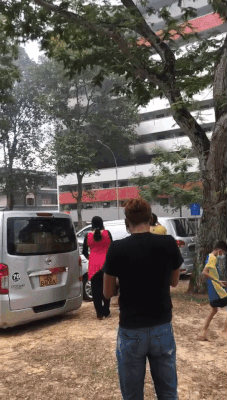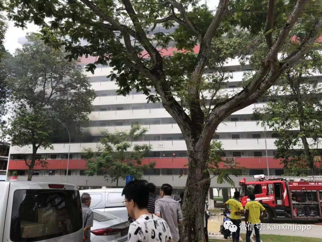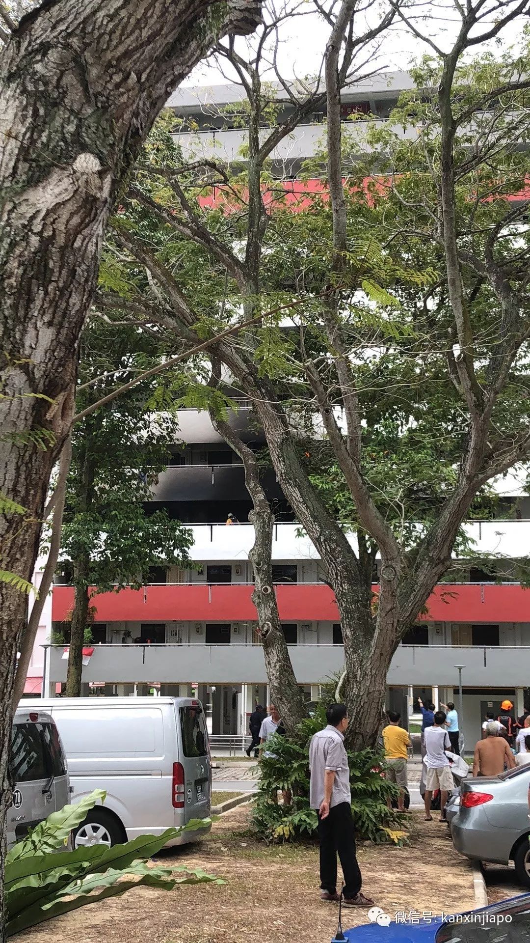 组屋外的白墙已经被熏成了黑色,不时还能看到往外冒的火,现场情况十分危急。