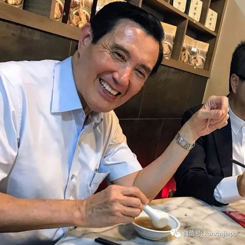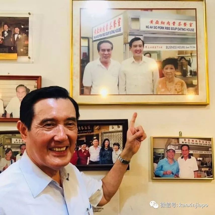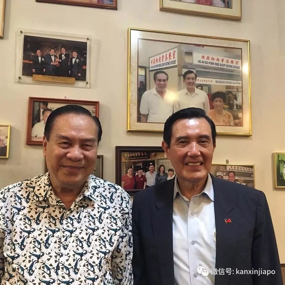 除了去新加坡地标鱼尾狮打了卡之外,马英九还去了肉骨茶店来了个故地重游~(背后相框里是年轻时的马英九)