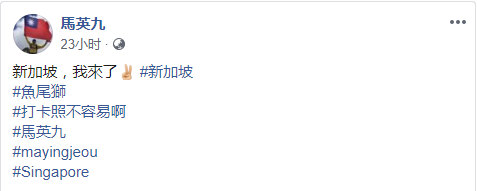 在贴文中马英九还用了中英文的“新加坡”标签。正文中最后的“耶”的手势,不知道是不是心情大好的证明。